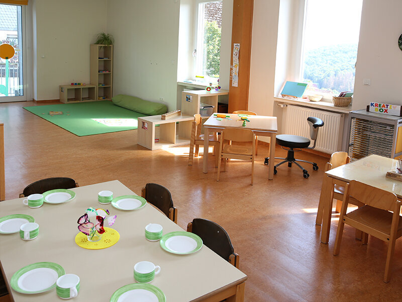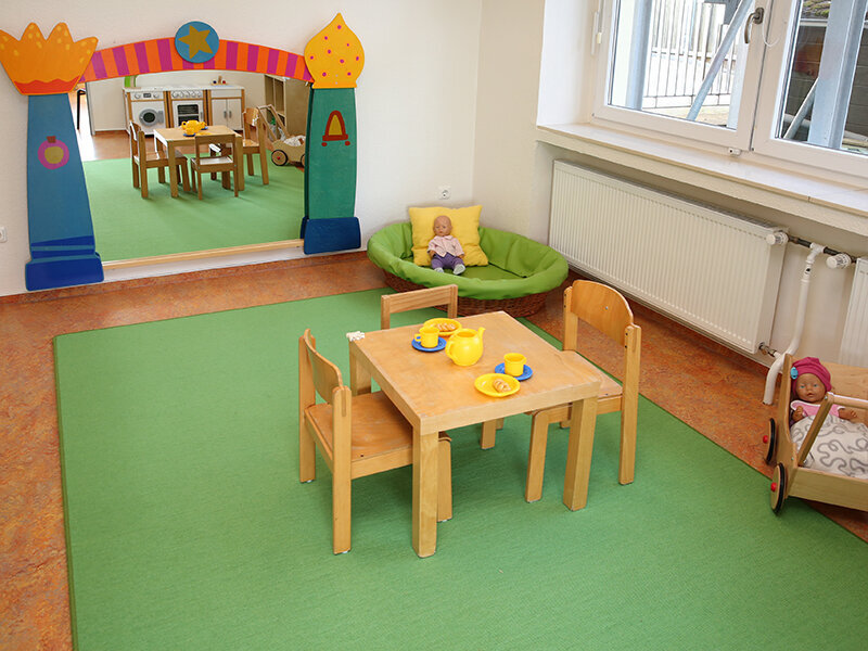 - Im Erdgeschoss und im Obergeschoss ist jeweils ein Gruppenraum und Nebenraum mit verschiedenen Spielbereichen, wie z.B. Bau- und Konstruktionsecken, Rollenspielbereich, Spielen und Puzzeln, Leseecke, etc. eingerichtet. In jeder Gruppe ist ein Kreativbereich gestaltet, der die Kinder zum Malen und Basteln einlädt.