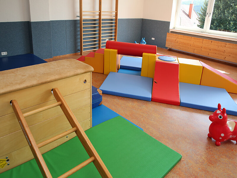 - Im Erdgeschoß steht den Kindern ein großer Bewegungsraum für vielfältige Bewegungserfahrungen zur Verfügung. Er ist ausgestattet mit einer Sprossenwand, verschiedenen Matten und einer Konstruktion zum Anbringen von z.B. Schaukeln, Tücher, Seilen, etc.