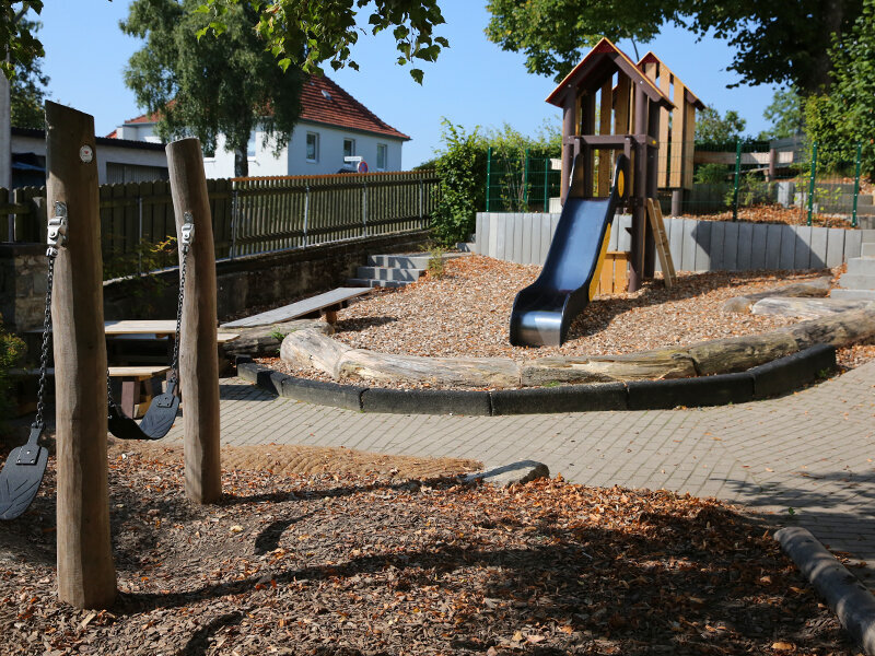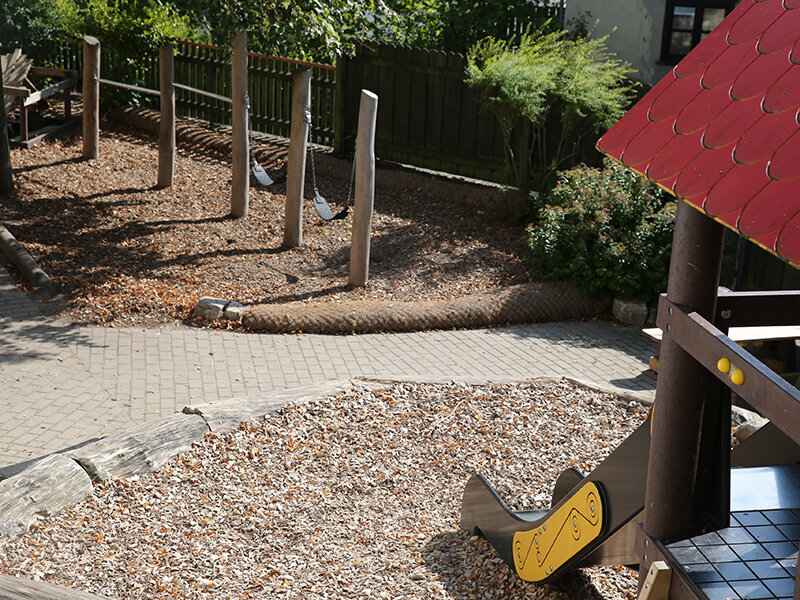 - Im Hangbereich des Außengeländes sind verschiedene kleinere Spielbereiche für die Kinder gestaltet, z.B. ein Bereich mit Schaukeln und Reckstange und weitere Bereiche mit einer Rutsche, einem Tipi, Sonnenliege, zwei Holzpferden und Spielhäuschen.